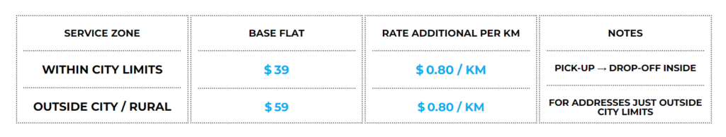 Cost = Base flat rate (based on zone) + $0.80 per km (pick-up to drop-off). For example, an inside-city delivery might cost $39 + (0.80 × distance in km).